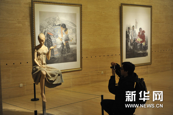 1月15日,一名出席展覽新聞會的記者在中國美術(shù)館拍攝一件即將展出的雕塑作品。新華網(wǎng)圖片 魯鵬 攝