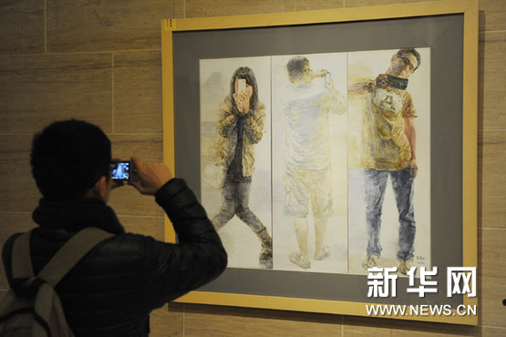 1月15日,一名出席展覽新聞會的記者在中國美術(shù)館拍攝一幅即將展出的繪畫作品。新華網(wǎng)圖片 魯鵬 攝