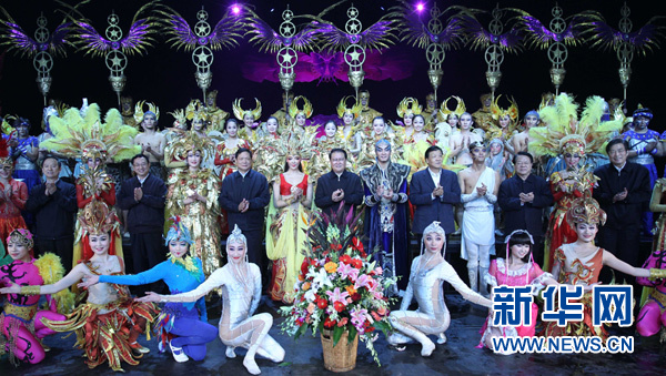 12月5日晚,中共中央政治局常委李長春來到北京歡樂谷華僑城大劇院,觀看由華僑城集團原創的大型舞蹈詩劇《金面王朝》。這是演出結束后,李長春等上臺祝賀演出成功。新華社記者 龐興雷 攝
