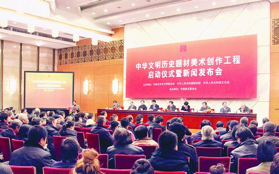 12月17日,經中宣部批準,由中國文聯、財政部、文化部主辦,中國美協承辦的中華文明歷史題材美術創作工程在北京人民大會堂啟動。全國政協副主席、中國文聯主席孫家正以及中國文聯黨組書記、副主席趙實,中國文聯黨組副書記、副主席覃志剛,中國文聯黨組成員、副主席馮遠,中國國家博物館館長呂章申,中國文聯黨組成員、書記處書記夏潮,中國作協黨組成員、書記處書記白庚勝,中國美協分黨組書記、駐會副主席吳長江與主承辦單位代表、全國各地著名美術家代表出席啟動儀式。中國美協秘書長劉健主持啟動儀式。