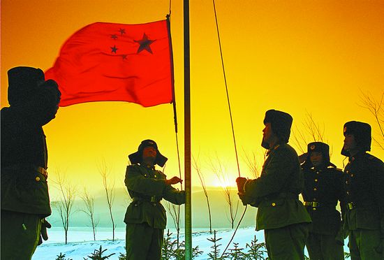 今年元月1日,中國文聯“送歡樂、下基層”赴黑龍江邊防線慰問演出采風團的有關領導和藝術家們在“東方第一哨”與官兵們共同迎接新年的第一縷曙光,共同升起2012年的第一面國旗,第一次踏上回歸祖國的黑瞎子島。我把“祖國衛士 東極哨兵”系列攝影作品作為禮物送給了戰友們,表達了我的一份心愿。作為攝影工作者,面對冰雪中英雄的哨兵、敬愛的邊關戰友,我的責任和壓力油然而生,藝術路上的堅守應該像戰友們駐守邊關一樣的執著。
