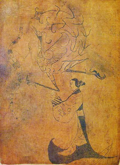 出土于湖南長(zhǎng)沙陳家大山楚墓的“龍鳳人物帛畫(huà)”,就是一幅“龍鳳配合圖”。畫(huà)面上的龍,豎身卷尾,頭臉朝天,肢爪劃動(dòng),躍躍欲上。旁邊是與它相對(duì)應(yīng)的鳳凰——昂首展翅,颯然飛舉。龍鳳之下,站一位雙手合掌、祈求升天的裙服女子。顯然,龍和鳳在這里是協(xié)同合作的關(guān)系,共同承擔(dān)著導(dǎo)引人們脫離俗塵、升達(dá)天堂的重任。