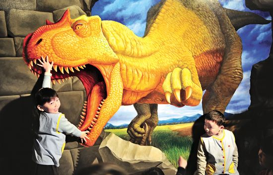 3月2日,第二屆日本3D藝術畫展在臺北科學教育館開展。此次畫展分為立體魔幻、森林探險、海底冒險等主題,共展出53件創意作品,讓參觀者體驗一次趣味盎然的3D視覺之旅。圖為畫展上,兩名小朋友與一幅3D立體畫合影留念。 新華社發 吳景騰 攝