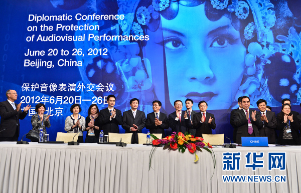 6月26日,《視聽表演北京條約》在京締結(jié)。“北京條約”的誕生,標志著談判了近20年的視聽表演者版權(quán)保護的國際新條約終于修成正果。隨著“北京條約”的締結(jié),由世界知識產(chǎn)權(quán)組織舉辦,中國國家版權(quán)局、北京市人民政府承辦的保護音像表演外交會議落下帷幕。本次會議是世界知識產(chǎn)權(quán)組織近16年來在版權(quán)領(lǐng)域召開的首個外交大會,也是新中國成立以來首次承辦涉及版權(quán)條約締結(jié)的外交會議。150多個國家、40多個國際組織的700多名代表齊聚北京,共商音像表演保護大計。新華社記者 李文 攝