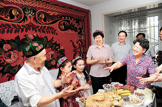 7月26日傍晚,阜康市一幢單元樓中傳出陣陣歡歌笑語,這是一戶普通的維吾爾族家庭,四代同堂,幸福美滿。中國文聯(lián)黨組書記、副主席趙實,中國文聯(lián)黨組成員、書記處書記夏潮,中國影協(xié)分黨組書記、駐會副主席康健民等與翟俊杰、陶玉玲等電影藝術(shù)家代表來到這戶維吾爾族老人家中親切看望慰問并送上慰問金、慰問品和DVD一體機。熱情的老媽媽為幾位到訪的貴客戴上極具民族特色的維吾爾族帽子,并帶著全家老小以一曲電影《冰山上的來客》的主題曲《花兒為什么這樣紅》迎接來賓。興之所致,陶玉玲帶頭唱起自己主演的電影《柳堡的故事》的主題曲《九九艷陽天》,大家一起唱起這熟悉的旋律,瞬間沒有了溝通的障礙。臨走時,老人一家堅持送到樓下,一再熱情地表示希望他們再來、常來。