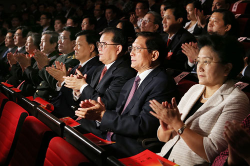 劉淇、劉云山、劉延東、徐才厚、陳至立、馬凱、阿不來提·阿不都熱西提、張榕明一同觀看。