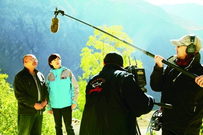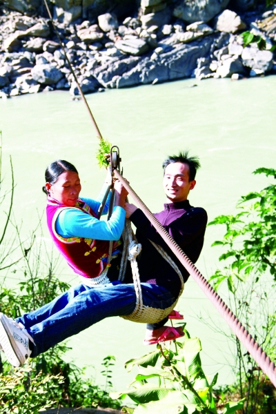 人民日?qǐng)?bào)記者(右)在云南省怒江傈僳族自治州采訪“溜索改橋”工程。