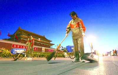 凌晨4點(diǎn)30分,北京日?qǐng)?bào)記者拍攝到在天安門地區(qū)進(jìn)行保潔工作的兩位環(huán)衛(wèi)工人。