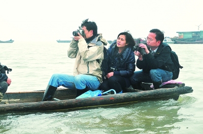 光明日?qǐng)?bào)記者歷時(shí)11天、跨越5省,深入我國(guó)基層水文站調(diào)研。圖為三位記者在鄱陽(yáng)湖采訪。