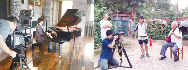 攝制組在拍攝著名鋼琴家李云迪(左)、滄州木板大鼓(右)