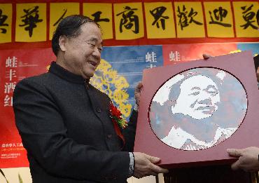 莫言在瑞典參加由瑞典華人工商界舉行的歡迎宴會時獲贈禮品。 新華社發
