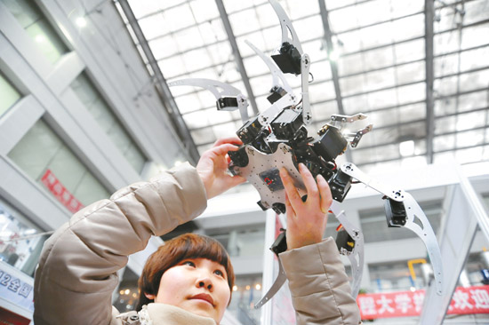 12月15日,哈爾濱石油學院大學生在演示他們設計制作的蜘蛛型偵查勘探機器人。當日,2012全國大學生創新設計大賽在哈爾濱工程大學舉行。由全國36所高校1000多名大學生精心設計創作的參賽作品達310件。一件件設計精美、功能實用和較高科技含量的作品,充分地展示了當代大學生熱愛生活參與生活,挑戰自我追求夢想的才能。