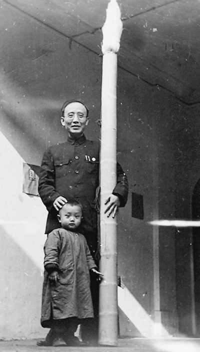 1941年,郭沫若手扶友人贈送的如椽巨筆,偕幼子漢英在重慶留影。