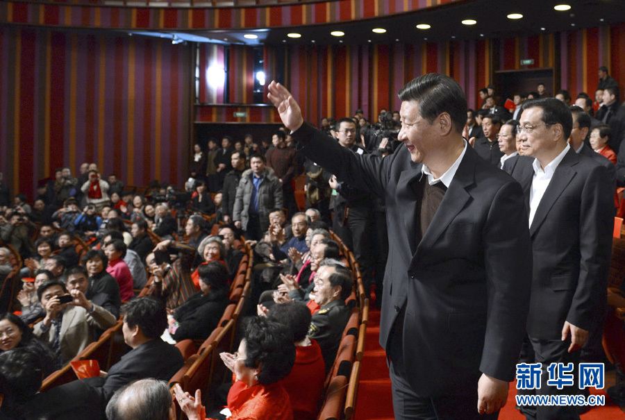 12月30日晚,2013年新年京劇晚會在北京國家大劇院舉行。黨和國家領(lǐng)導人習近平、李克強、張德江、俞正聲、劉云山、王岐山、張高麗,與首都近千名群眾一起觀看演出,喜迎新年的到來。這是習近平向演員和觀眾招手致意。新華社記者 馬占成 攝