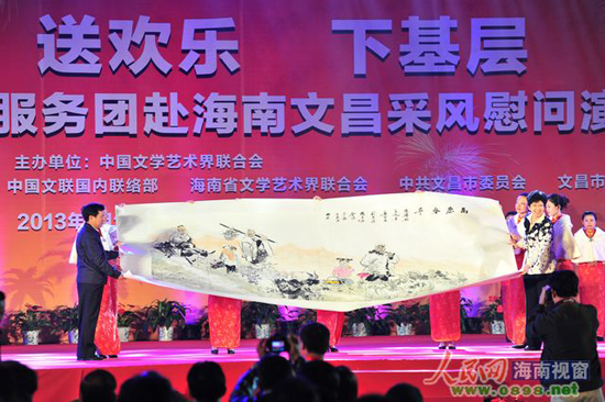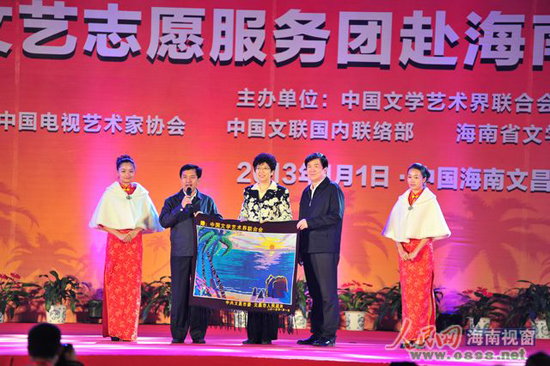 在慰問演出前,中國文聯(lián)和文昌市領導分別致詞,并互贈送紀念品。