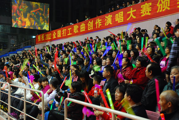 在中國地圖上,廣東東莞塘廈鎮并不是很起眼,但就是這個面積只有128平方公里、人口只有4.7萬人的小鎮,卻擁有外資企業1200多家,民營企業3500多家,外來打工者近50萬人。“打工者”這個中國改革開放以來涌現的新群體,在這塊土地上得到最集中的體現。因此,1月11日在塘廈鎮體育館舉辦的“2012全國打工歌曲創作、演唱大賽頒獎晚會”,便受到打工者的熱烈歡迎。現場觀眾揮舞著手中的熒光棒,歡聲雷動,向為他們寫歌的詞曲作者、為他們演唱的歌手致謝。