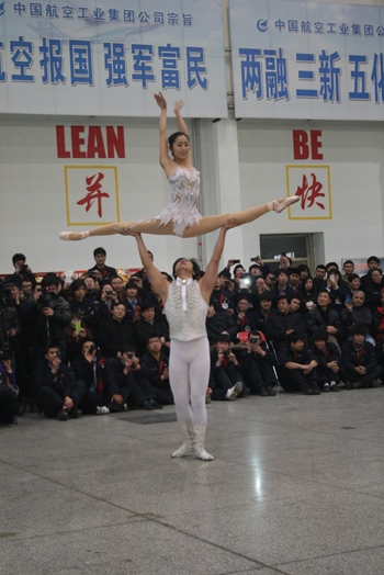 魏葆華、吳正丹在民機39廠車間表演《東方的天鵝——芭蕾對手頂》