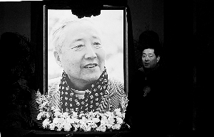 昨天上午6點(diǎn)半,人藝的新老領(lǐng)導(dǎo)與部分演員趕到協(xié)和醫(yī)院,進(jìn)行了一個(gè)小型的內(nèi)部告別儀式。7時(shí)許首都劇院已經(jīng)打開(kāi)大門(mén),門(mén)口拉著黑色橫幅“人民的演員,永遠(yuǎn)的于是之”,內(nèi)部則放置著大幅于是之遺像,全日開(kāi)放供人們前來(lái)吊唁。陸續(xù)趕來(lái)的工作人員、普通群眾聚集在大廳兩側(cè),很多人手執(zhí)橫幅挽聯(lián)“先生千古”、“走好是之”。