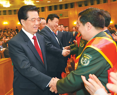 2月1日,2013年軍民迎新春文藝晚會在北京人民大會堂舉行。胡錦濤、習近平、吳邦國、溫家寶、賈慶林、李克強、張德江、俞正聲、劉云山、王岐山、張高麗等黨和國家領導人與首都軍民歡聚一堂,共迎新春。這是晚會開始前,胡錦濤、習近平等同全國雙擁模范城(縣)代表親切握手。 新華社記者 查春明攝