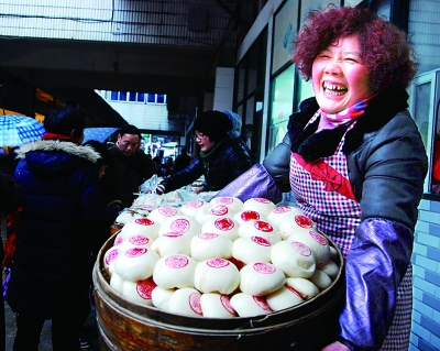 2月7日,在浙江省建德市新安江農貿市場里,店主朱汝珍趕制了兩萬多個印著紅色“喜”字的饅頭、荷葉包等傳統的鄉土過年食品。寧文武攝/光明圖片