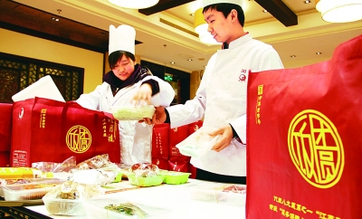 2月7日,蘇州某飯店服務員為“打包年夜飯”配菜。新華社發 朱桂根攝