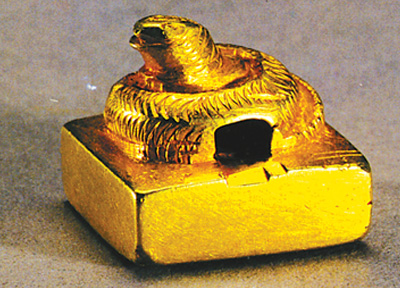 蛇,在中國古代也被視為豐收或子孫繁衍的象征物,特別是在西南或南方地區的古代文化中,常見以蛇為母題的文物。年代最早的是相當于商代晚期古蜀人遺址出土的圓雕石蛇,在四川省成都金沙遺址至少發現過4件,石蛇頭三角形,圓目張口,口唇涂成朱紅色,身軀呈“S”形蟠曲,被認為是用于祭祀或與原始宗教有關的道具。南方地區的青銅器,也常飾有蛇紋,例如廣西恭城出土的春秋時期的青銅尊上就有生動的雙蛇斗蛙連續圖案。稍遲一些生活在西南的古代民族更常以蛇為豐收或大地的象征物,例如云南省晉寧石寨山、江川李家山等地發掘的古代滇人的墓葬中,經常出土以蛇造型的文物。有以蛇頭作銎的青銅鏟,也有以蛇體作柄的青銅劍,柄首是張口的蛇頭,形態極為生動。至于大量出土的以鳥獸人物為題材的青銅扣飾上,更是多飾有糾纏蟠曲的長蛇。一些表現祭祀、祈年等場景的青銅儲貝器蓋上的立體群雕中,也少不了蛇的身影。特別是在一座滇王的墳墓中,出土了西漢中央頒賜的黃金印,印文為“滇王之印”,印上的印紐也鑄成一條蟠曲的金蛇,成為滇王高貴身份和權威的象征。