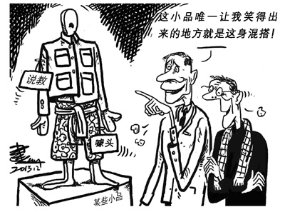 當然,光說理容易,光逗樂也不太難,既講道理又把人笑翻的確不是容易的事,非要有點兒思想家的頭腦、哲學家的智慧、辭賦家的語言、過來人的滄桑,還要再加上幽默大師的天賦才成。這樣的要求,對于相聲小品來說是有點高。就拿同時呈現于晚會的姊妹藝術——歌曲和舞蹈來說吧,但凡詞曲過得去、演唱者不走調,或者編舞不太蹩腳、舞者不太糟糕,觀眾就能坐住,不至于挑三揀四。相比之下,相聲小品的運氣就沒那么好了,如果不能高級地逗人樂,被會被指責,讓人坐不住。