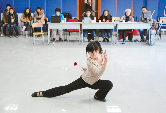 日前,在中國(guó)傳媒大學(xué)南廣學(xué)院,報(bào)考演藝學(xué)院的一名考生在形體項(xiàng)目的考試中表演舞蹈。