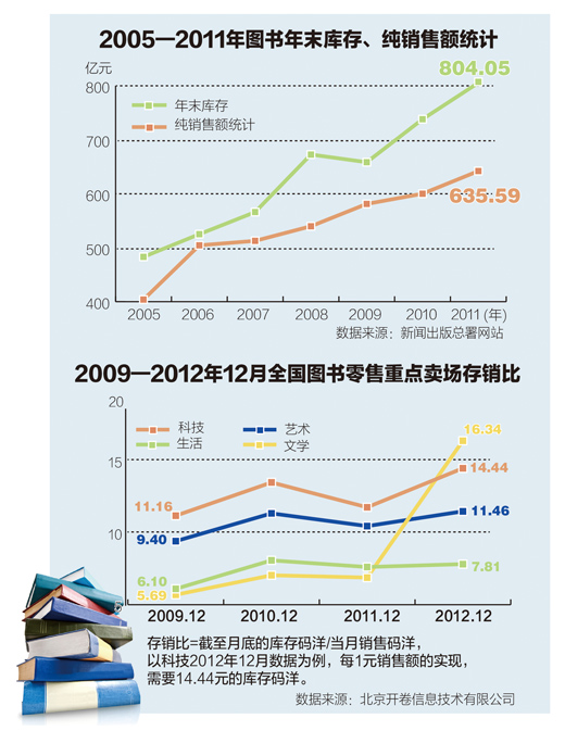 繁榮的景象之下,卻是日漸沉重的庫存負荷。全國新華書店系統、出版社自辦發行單位純銷售額從2005年的403.95億元增長到了2011年的653.59億元,而年末庫存則從482.92億元飛漲到804.05億元。6年時間,兩者的剪刀差從近79億元增長至150億元——庫存跑贏了銷售,更多圖書只能在倉庫中蒙塵。