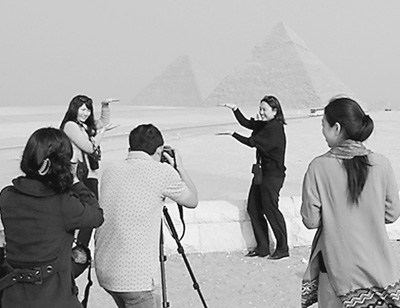 春節(jié)長假期間,埃及金字塔前七成游客都是中國人,他們給埃及蕭條的旅游業(yè)帶來了一絲起色。圖為在金字塔前合影留念的中國游客。 黃培昭攝 |