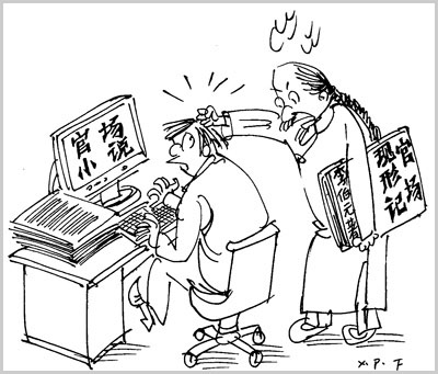 “總是有一個貪官,這個貪官有一個貪得無厭的老婆,少不了還要有一個情婦,最后事情就是由這個情婦敗露,此外必然有一個見義勇為的記者,甚至是美女記者介入……”事實上,“官場小說”對相互傾軋的權力斗爭給予濃墨重彩的“仿真”描寫,以滿足或迎合一些讀者的獵奇心理,自覺不自覺地導致了題材和寫作手法的同質化。官場小說的程式化、類型化因作者思維狹窄和僵滯日見彰顯。人們對此類小說套路的純熟,本身就說明了問題。