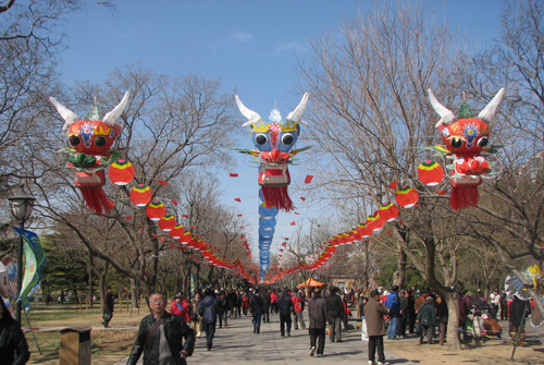 4月6日,在北京陶然亭公園內東門主干道上空懸掛的3條身長達120米的巨龍風箏并排飛舞,中間龍身圖案是56個民族,兩側龍身是京劇臉譜,道路兩側一個個造型別致的風箏造景奪人眼球。當日,以“與風共舞,沁游陶然”為主題的第二屆風箏春花文化節在該園舉行,1300余只造型各異的風箏在此展出。