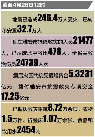 ●地震后4小時(shí),雅安到蘆山的公路打通。當(dāng)晚,蘆山縣城恢復(fù)市政通電。