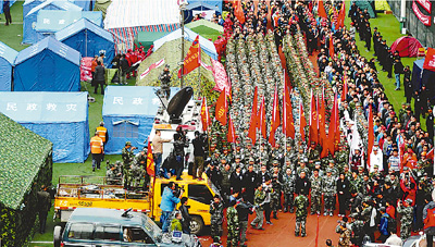 人民日報蘆山4月27日電(記者劉裕國、崔佳、劉志強)巴山動情,蜀水含悲。27日,四川省深切哀悼“4·20”蘆山7.0級地震遇難同胞活動在蘆山縣人民政府廣場舉行。四川省委省政府、成都軍區(qū)負責(zé)人,參加救援的解放軍及武警部隊代表、公安民警和醫(yī)護人員代表、災(zāi)區(qū)干部群眾及志愿者代表等130余人參加了哀悼儀式。