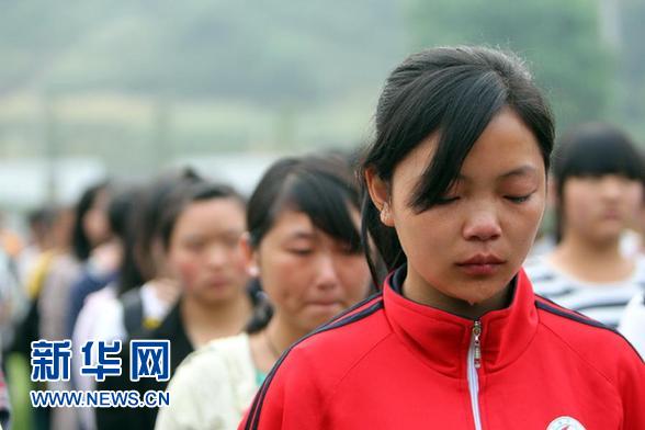 4月27日,四川省雅安市蘆山中學(xué)舉行悼念儀式,師生集體為在地震中逝去的同胞默哀。當(dāng)日,社會各界為四川蘆山“4·20”7.0級強烈地震遇難者致哀。 新華社發(fā)(薛玉斌 攝)