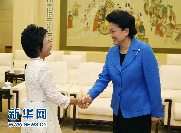 4月27日,國務院副總理劉延東在北京會見出席國際和平藝術家作品展的外國友人。這是劉延東與吉爾吉斯共和國副總理塔利耶娃握手。新華社記者姚大偉攝