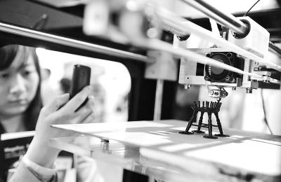 5月8日,在上海國際展覽中心,一名觀眾拍攝一臺正在打印椅子模型的3D打印機。 新華社發(賴鑫琳攝)
