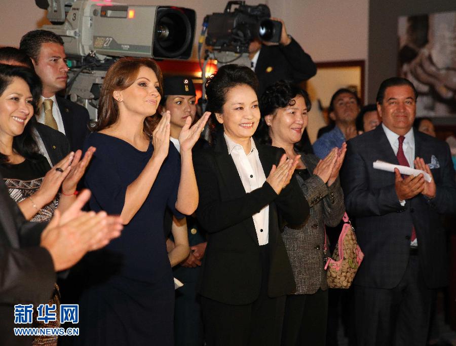 6月5日,中國國家主席習近平夫人彭麗媛在墨西哥總統(tǒng)夫人里韋拉陪同下,來到墨西哥特萊維薩電視臺電視劇制作中心參觀。 新華社記者 丁林 攝