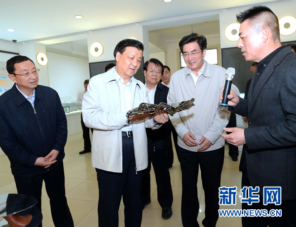 劉云山在北京工業(yè)設(shè)計創(chuàng)意產(chǎn)業(yè)基地觀看產(chǎn)品展示,聽取工作人員介紹企業(yè)發(fā)展情況。新華社記者 李濤 攝