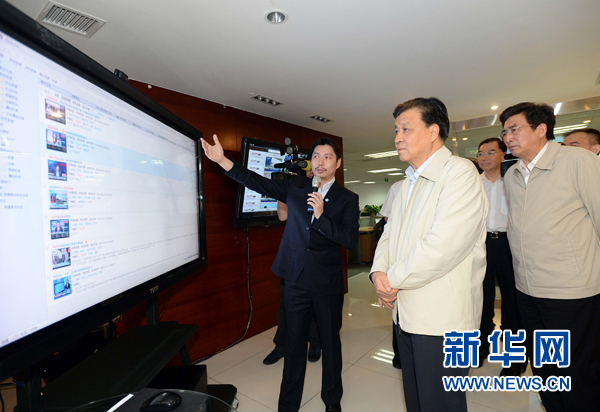 劉云山在中關(guān)村科技園雍和園天脈聚源傳媒科技有限公司聽取工作人員介紹企業(yè)文化創(chuàng)新與科技創(chuàng)新融合發(fā)展情況。新華社記者 李濤 攝