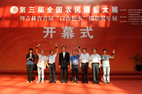 第三屆全國農民攝影大展6月8日在吉林長春開幕。圖為中國文聯黨組成員、書記處書記李前光,中國文聯副主席段成桂,以及中國攝協主席、分黨組書記王瑤等與會領導為獲獎作者代表頒獎。 浦時 攝