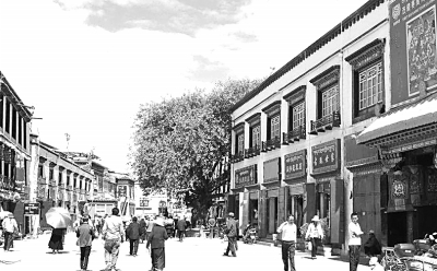 拉薩老城區(qū)居民漫步在經(jīng)過(guò)改造的著名轉(zhuǎn)經(jīng)道“八廓街”上。資料圖片