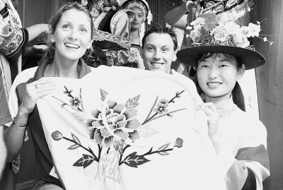 國(guó)外友人體驗(yàn)中國(guó)文化繡出傳統(tǒng)牡丹花 CFP