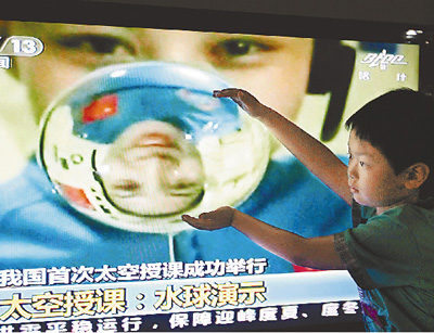 北京小學(xué)生饒有興趣地在電視機(jī)前與航天員“互動(dòng)”。本報(bào)記者 李 舸攝
