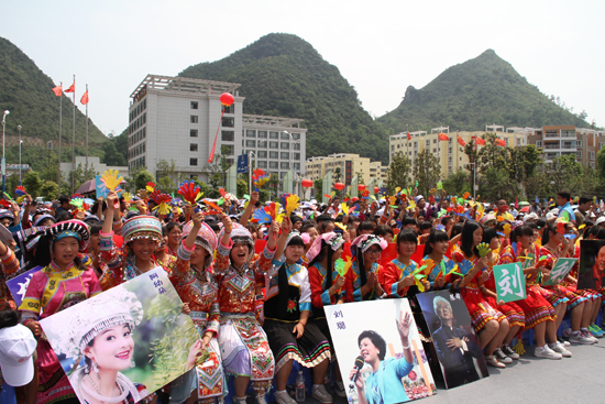 演出當天,天氣異常炎熱,但人們熱情更高。“在聽相聲呢”,小伙子電話“匯報”著演出情況;老大爺帶著望遠鏡,早早和老伴兒趕來占了個好位置。港安水泥公司的何陳與百余位工友看得合不攏嘴,忙著拍照,“現場看到這么多知名藝術家,我們老百姓高興!”穿著少數民族盛裝的關嶺民族高級中學高一學生馬鳳蘭是個漂亮的布依族女孩,她看到了她的老鄉、著名歌手阿幼朵,激動極了。回到家鄉的阿幼朵一曲高歌,在開場演出中把氣氛調動得異常火熱,她自己也很興奮:“感謝中國文聯關心我的家鄉,惦記著我的兄弟姐妹。”