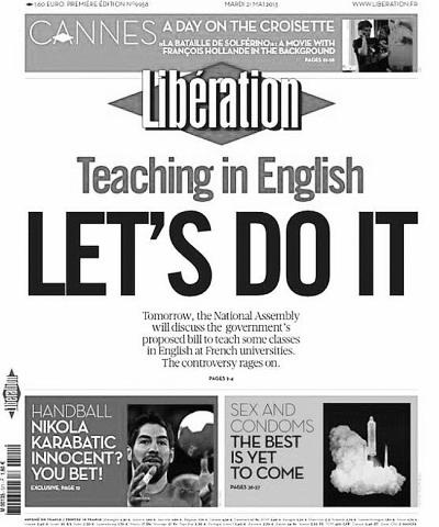 據法國全國性大報、左翼最大的報紙《解放報》統計,法國目前已有790種高校課程用英語上課。該報認為菲奧拉索部長的想法沒錯,5月21日的封面甚至只用英語,赫然打出大標題“Teaching in English LET’S DO IT”(“用英語教學,讓我們這么干!”)?!督夥艌蟆反碇▏諠u壯大的一個群體,他們的特點是年輕、都市化、新潮。20年來,他們在生活中大量使用法式英語。在他們看來,負責提供語法建議和新外來語替代詞的法蘭西學術院早已過時。