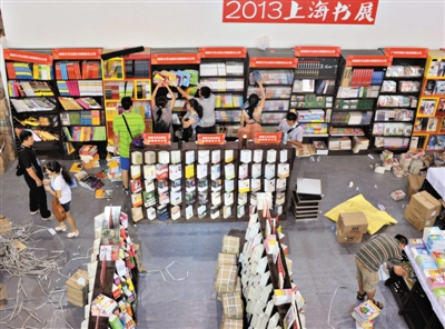 8月13日,在上海書展一出版社展位,參展工作人員在整理書架。新華社發