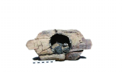 12號墓是座形制較為完整的墓葬,墓底有原木搭成的尸床,尸床上為一男尸,其肢體西側有一用于火祭的容器。容器中間鑿出圓坑,出土時中間還有15枚石子,圓坑的內壁被火灼得發黑。