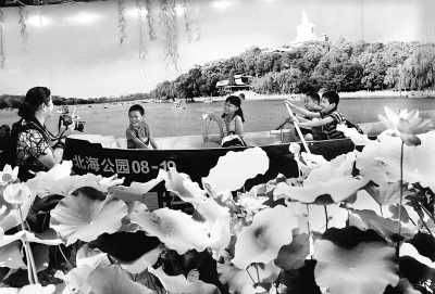 圖一:園區巧妙營造出后有白塔做背景、前有荷花做映襯的“讓我們蕩起雙槳”互動效果區,讓游客親身體驗手握船槳的感受,仿佛置身于北海公園波光粼粼的湖面上。