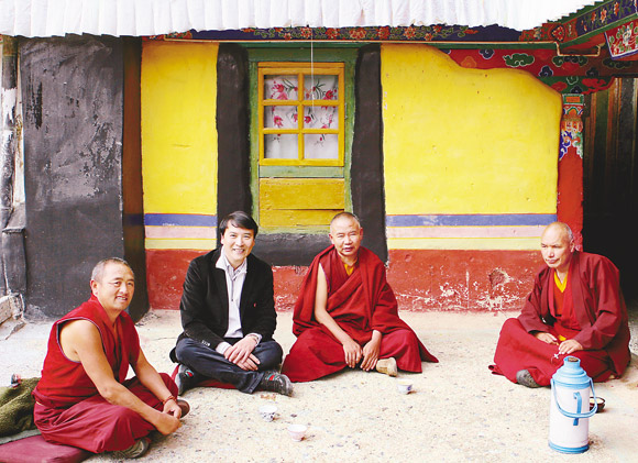 葉小綱20多年來一直堅持西藏題材音樂創作,圖為他在西藏薩迦寺與喇嘛席地交流